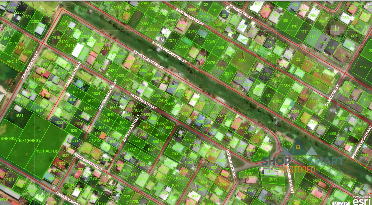 This spacious corner lot, with an area of 1278.25m², is located on the corner of Houtbijstraat and Tjamlokostraat. The frontage is 30m on Houtbijstraat and 37.90m on Tjamlokostraat.